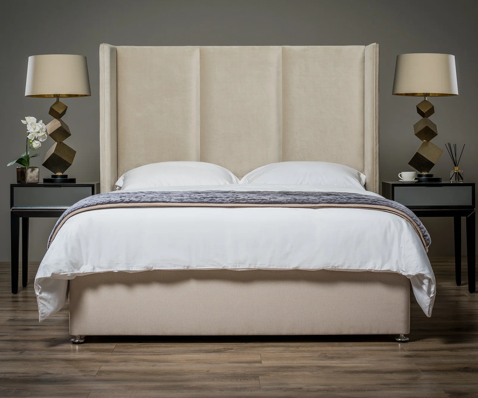 Our 3-Panel Winged Headboard will fit any standard UK size divan base.