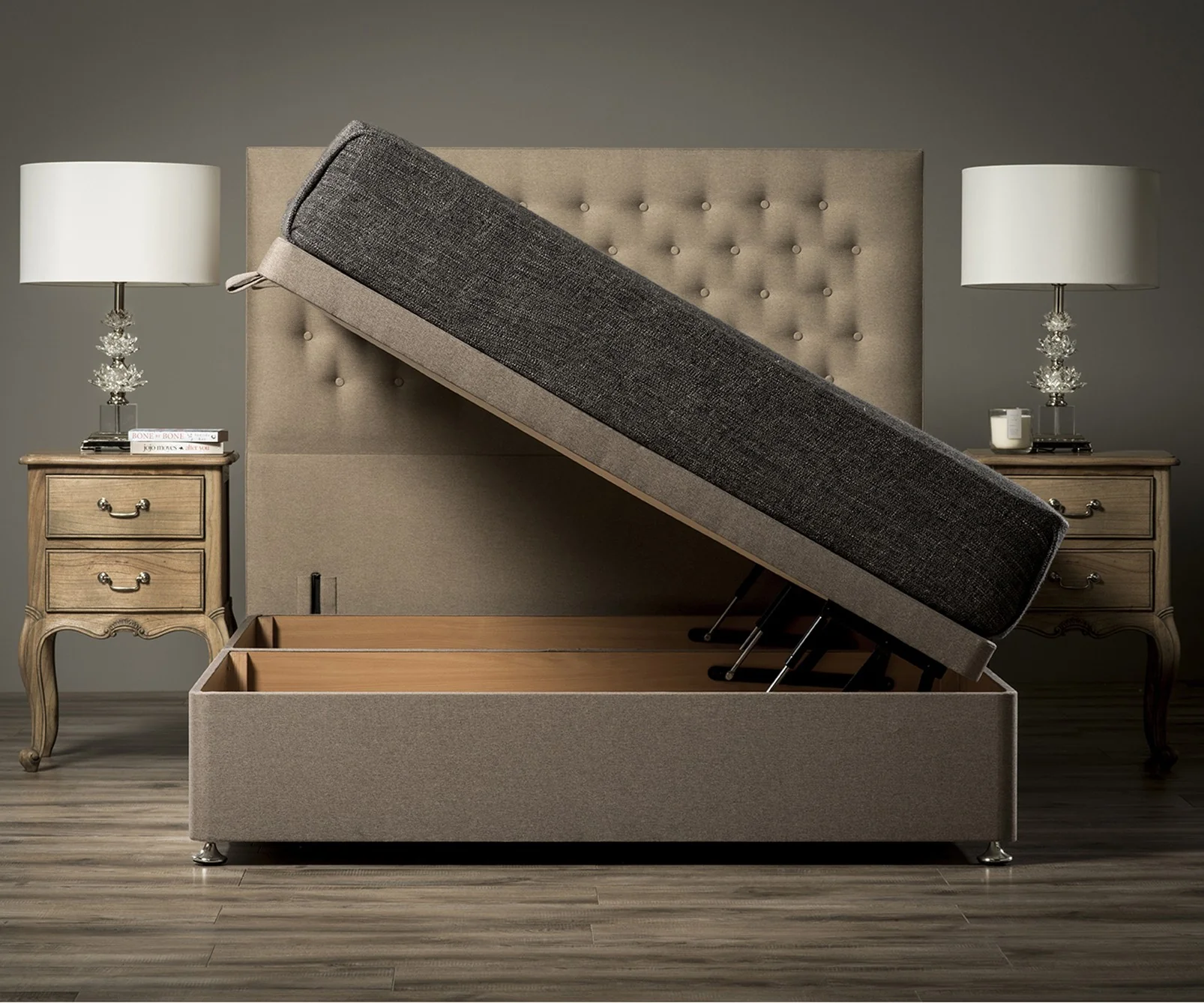 Are you looking for a mattress base that offers maximum storage? You've arrived at the right place. OurĀ Side Ottoman Bed boasts four times the storage space of traditional divan beds yet takes up the same room space as a regular divan bed. The SideĀ Ottoman Bed Base is a universal product that can be easily configured to open from the lefthand or righthand side. Two stylish tags are sewn into the base lid to allow for controlled lifting even when your mattress is in place.Ā The construction is incredibly robust, and the divan bed base is strong enough to hold heavy weight.